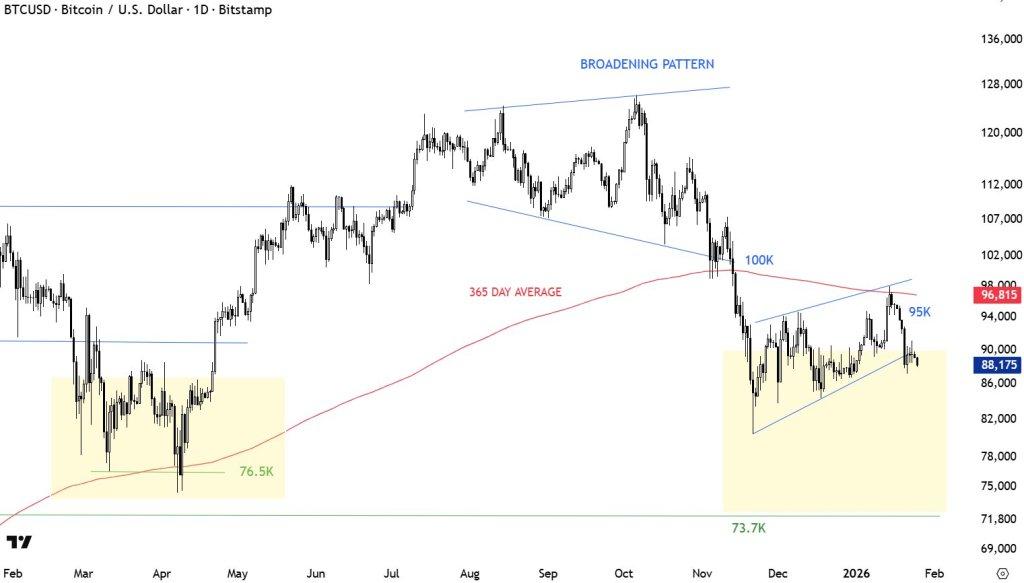 伯尼斯克写道他表示自己“目前还不是买家”,但列出了几个正在关注的价格区间。他认为,大约 8 万美元是关键价位,因为它是 2025 年 11 月的低点,也是当前下跌行情的局部低谷。在此下方,他重点关注了大约 7.4 万美元,将其与 2025 年 4 月的低点联系起来,并称之为“关税风暴”的底部;他还指出,该价位略低于……战略(MSTR)据称比特币的成本基准约为 76,000 美元。