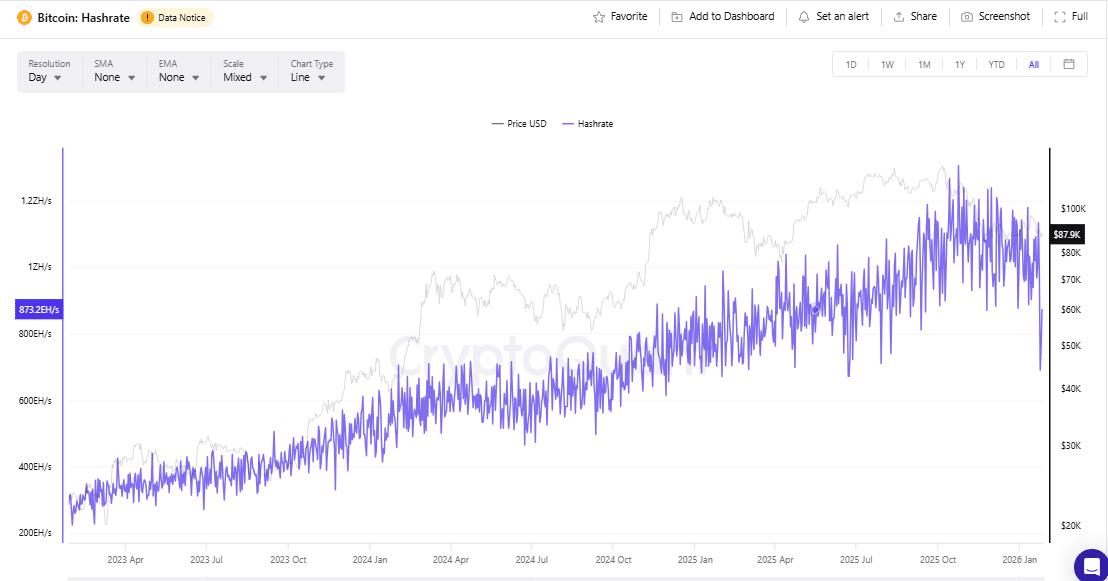 数据来自 CryptoQuant 的数据表明,比特币网络哈希率比特币挖矿算力在48小时内从约1.133 ZH/s骤降至约690 EH/s,降幅达39%。此次下降恰逢美国遭遇极端寒冷天气,而美国拥有全球近三分之一的比特币挖矿算力。