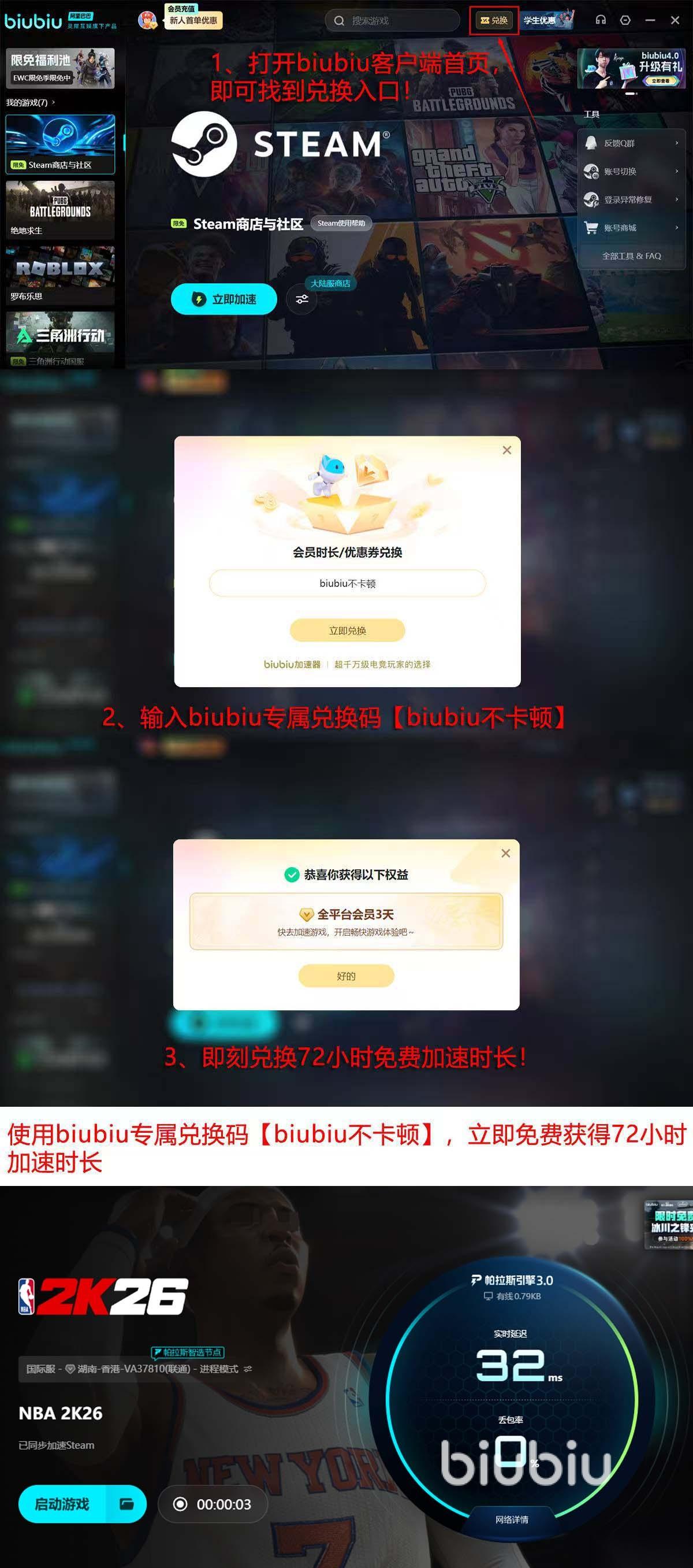 其实作为体育竞技游戏2k26,使用biubiu是极其合适的,提高对键盘按键或者鼠标按键敏捷反应能力,对于对战过程中的玩家,更合适,近期被网络搞破防的小伙伴,可以先领取4天时间试试效果。领取方法是,注册新账号后,账号会直接得到系统送的24小时,然后把提供的口令【biubiu不卡顿】,粘贴到首页“兑换”窗口内,就能再得到72小时,2个时间上线就领,可叠加在有96小时。