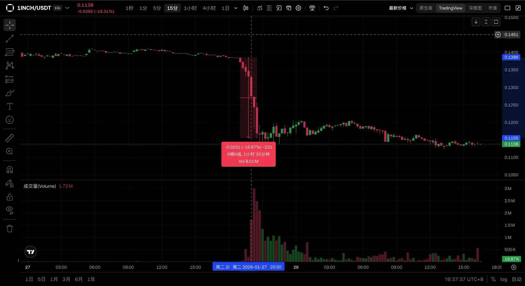 然而,即便最终被证明是一场误读,这次卖出对 1INCH 本就持续走弱的价格而言,依然构成了现实层面的二次冲击。自上一轮周期高点 6 美元起,1INCH 已经历了长期的单边下行,如今徘徊在 0.11 美元附近。