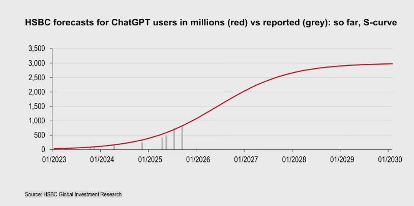 以上几种情况的组合当然大家可以看出来,上述情境中大部分是偏负面的预测,没有覆盖所有可能出现的情况。不过站在 2026 年初的时间点,AI 泡沫论甚嚣尘上,我们还是要围绕事实——OpenAI 并不乐观的财务境况,来看看数字背后的故事。订阅补贴带来沉重负担在 OpenAI 官方发布的《2025 年企业 AI 状况报告》里,CEO 山姆·奥特曼透露了 ChatGPT 周活跃用户超过 8 亿。这是一个非常优秀的里程碑,毕竟 8 亿约等于全球人口的 10%。但尴尬的是,在这些用户中付费订阅用户只占约 5%,即 4000 万人左右。然而,去年汇丰对 OpenAI 的收入模型进行了分析,指出由于 AI 基础设施建设将在未来 5 年内对 OpenAI 造成至少 7920 亿美元的成本,OpenAI 需要在 2030 年初实现 30 亿周活跃用户,并且将付费用户比例提高到 10%,才能够避免「入不敷出」,甚至资金链断裂。换句话说,OpenAI 的周活用户量只需要再翻两倍多一点,但是付费用户数量却需要增长 6.5 倍。这份报告来自于汇丰环球投资研究 (HSBC Global Investment Research),去年 11 月 24 日发布,名为《OpenAI:重新分析承诺与现金流》(OpenAI: Reassessing Promises and Cash Flow),作者是欧洲 TMT 和全球科技解决方案的首席 Nicolas Cote-Colisson。