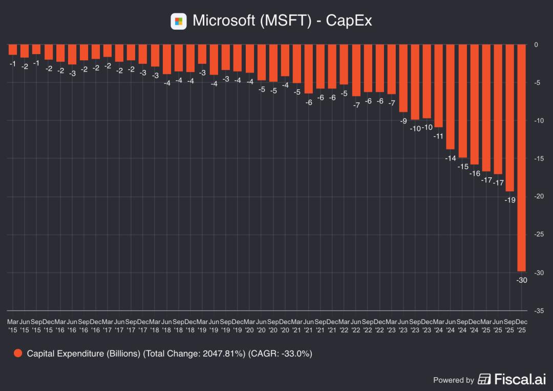 问题是,填补窟窿的方法还没有找到,但 OpenAI 继续花钱的承诺已经给出去了:在接下来的 5 年里,日常产品服务的后端造成的数据中心租赁费用可能高达 6200 亿美元——OpenAI 的用户增长速度早已超过了数据中心修建的速度,所以不得不从微软、亚马逊、甲骨文等租用数据中心提供算力。还有电费,OpenAI 对于 Stargate 数据中心的目标,是到 2030 年底拥有超过 36吉瓦的 AI 算力,相当于比美国佛罗里达州还要大的用电需求。根据汇丰的估算,算力租赁、基建、电力相加起来,OpenAI 未来 5 年内的基础设施总成本将高达 7920 亿美元,其中算力账单将高达 4300 亿美元。基建的投资增速只增不减:CEO 奥特曼还提出未来 8 年总计 1.4 万亿美元的总算力承诺。OpenAI 需要更多的钱,但已经投进去的巨头当中开始有人坐不住了。以微软为例,其最新财报显示云计算 45% 的积压订单来自 OpenAI。但与此同时,微软的资本支出增幅高达 89%,完全突破了最近 10 年以来的 CAPEX 曲线。财报发出后,微软股价一度暴跌 10%。