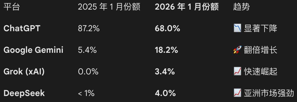 OpenAI 的估值,赌的其实是它能够从 AI 产品、服务商和基模供应商,进化为一个全球级别的 AI「基础设施」。但如果 2027 年之前它无法通过各种方法实现前面提到的付费用户增长,并且获得规模更离谱的新融资的话,7500 亿美元估值将面临巨大的回调压力。事实上,整个 AI 行业都被卷入了这场前所未有的烧钱竞赛。根据 IDC 等多家研究机构的数据,2025 年 AI 基础设施支出达到了惊人的规模:四大科技巨头(亚马逊、微软、Alphabet 和 )去年在 AI 基础设施上的资本支出超过 3000 亿美元;瑞银估计,全球企业在 AI 基础设施上的支出,在未来几年内将上升到每年 5000 亿美元。这种前所未有的基础设施投资浪潮,是由 AI 模型的巨大计算需求,以及主要技术公司之间 AI 能力和产品的激烈竞争所驱动的。传统软件实现规模化的成本更低,但 AI 能力的规模化需要天量的前期投资。随着模型越来越大,训练和推理的成本只会继续上升。每个模型推理的高昂成本,包括并不限于显卡算力、电力、运营成本、人力成本等等,都进一步加剧各公司财务的紧张。市场份额刺刀战虽然 ChatGPT 在 2025 年曾一度凭借网页端超过 80% 的流量(数据源自 Visual Capitalist)建立起接近垄断的优势,但到了 2026 年初,这种优势正在被迅速蚕食。根据 Similarweb 2026 年 1 月的最新监测(和 Visual Capitalist 统计相比,增加了移动端的统计口径),随着 Google Gemini 在 Android 生态的深度发力,ChatGPT 的总体流量份额在 68% 左右,而 Gemini 则成功突破了 18% 的关键门槛。这意味着,AI 聊天市场已从「一家独大」开始进入双雄争霸,甚至群雄并起的新阶段。