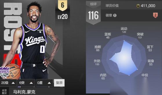 杰伦大帝作为游戏中比较便宜就能入手的空间型内线,122的三分就是他卖点之一,本次更新中还加了48点盖帽来到122,虽然进攻板砍了23点,但双板依旧维持在一个点亮的数值,够用。在王朝模式中做替补四号位也能比较轻松胜任,缺点是个子较矮,体力低了一些。
