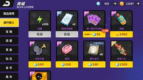商场:主要道具配件获取地,精品推荐板块偶尔会更新一下氪金礼包,咱平民微氪党主要注意2500金币的蓝券十连,6元160钻的江南矿场,及各种等级和段位礼包,旅商可以买一下配件武器皮肤和动作,主要注意的是每天的免费150电量,大部分时间都在的240金币两个蓝券 一些便宜的氪金武器比如:一元的唯一配三选一,80钻的唯一配三选一,25钻的紫券,不推荐用钻石买粒子和其他钻石的配件,2400金币的配件好用就买,宝箱有蓝券箱和紫券箱都可以开出皮肤,紫券还可以开出橙(传说)皮肤配件等哦,一个蓝券400金币一个紫券100钻,重复的蓝皮或玩具转化为对应价值的金币,重复的紫橙皮或武器皮肤玩具转化为皮肤服饰币,扭蛋每赛季会刷新新橙配和四个紫配的专属池子(还是能开出其他配件),保底150出新橙配一般持续一个月左右,然后会出紫皮或橙皮池子(以往的赛季战阶皮),12发保底紫皮,40发保底橙皮 盲盒没什么好说的,每天11点刷新(有时变动),12个盲盒看隐藏款的配件再决定要不要抽概率都一样,盲盒币50钻可以通过其它方式获取,黑市当你获得皮肤服饰币或精金(重复金配)时开启120精金可以换一个金配,800皮肤服饰币可以换一个传说武器皮肤,1000可以换怪博士的嫌疑人或者马男的黑白猫