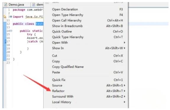 2、在弹出的下拉菜单中选择“Refactor”。