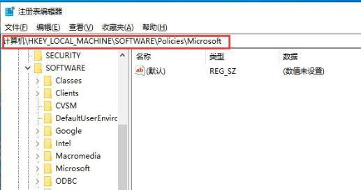 2、进入到注册表编辑器窗口中,依次展开“HKEY_LOCAL_MACHINESOFTWAREPoliciesMicrosoft”,如下图所示。