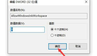 5、最后修改:AllowWindowsInkWorkspace,在打开的编辑窗口中修改数值数据为0,完成后重启,如下图所示。