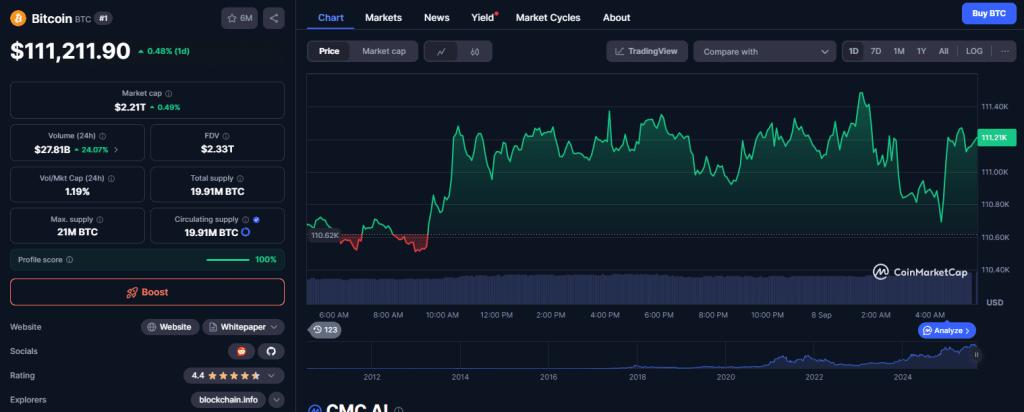 比特币过去 24 小时内,比特币交易价格稳定在 111,200 美元左右,较 8 月中旬的 124,000 美元高点下跌 10.5%。CoinMarketCap.