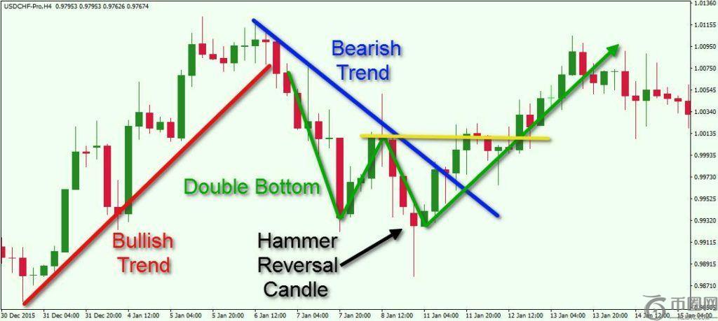 本交易图表展示了多头与空头趋势,图中标注了关键技术指标,如双底形态和锤头反转 K 线。