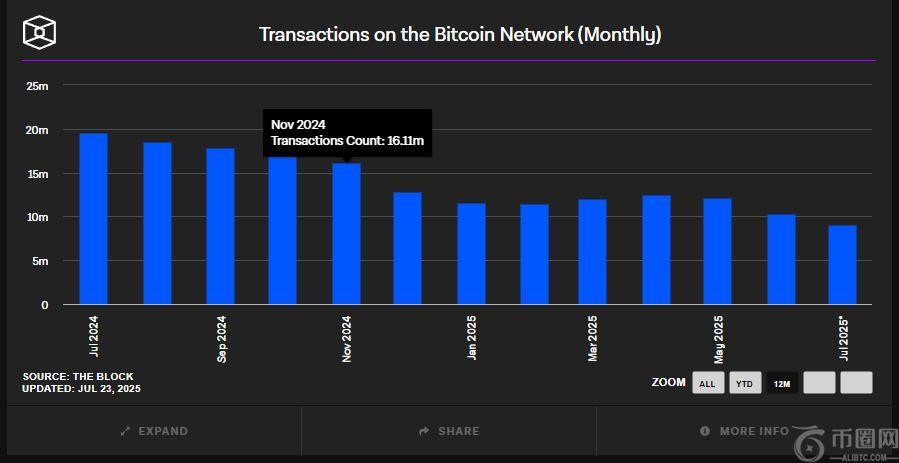 该图表显示:2024 年7 月月交易量达 2000 万笔峰值,11 月回落至 1611 万笔。交易量攀升可能暗示持币意愿下降。