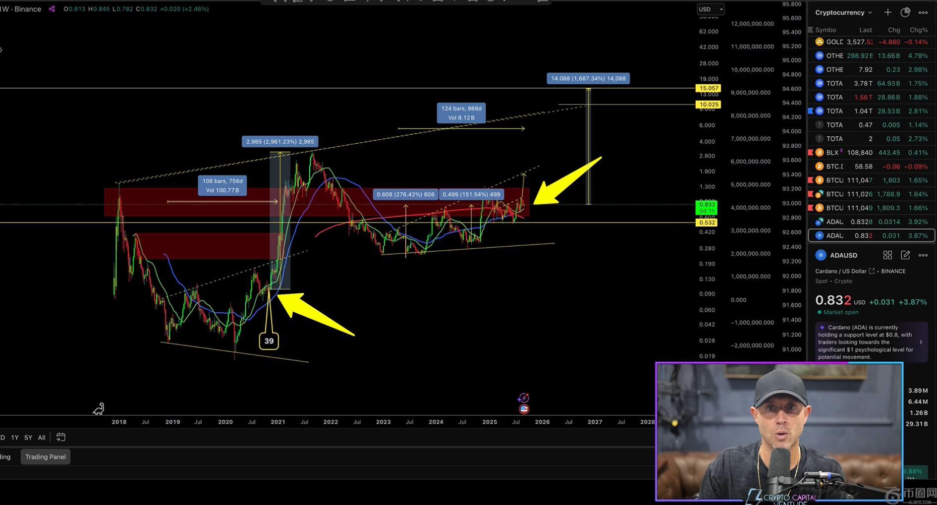 现在, 卡尔达诺(ADA)已经面临重的最近几周的抛售压力加密市场继续搏斗充满不确定性。截至发稿时,ADA 交易价格接近 0.835 美元,较最近五个月的高点 1.02 美元下跌近 18%。