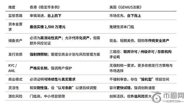 2025年8月1日,香港《稳定币条例》正式实施,成为全球首个针对法币锚定型稳定币的专门监管框架。这一框架体现了“审慎渐进”的监管风格,设置了高资本金门槛、严格的储备要求、KYC实名制以及对商业模式可持续性的审查。相比之下,美国《GENIUS法案》则采取了“市场优先”的理念,未设硬性资本金要求,发行路径更加多元,更多依赖市场筛选和用户选择。
