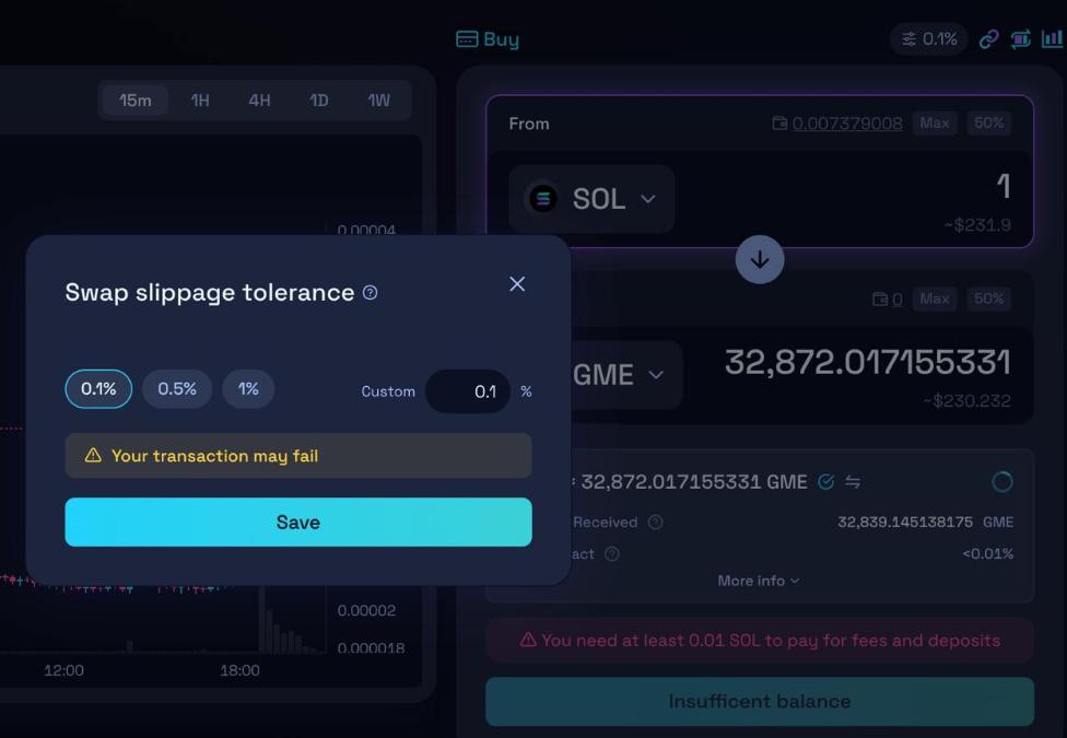 在Raydium 购买代币的操作:连接钱包后搜索目标 Meme 币(如在 pump.fun 上创建的 Meme 币或 GME on Solana)。