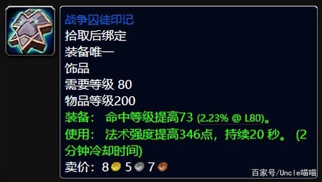 方才才说了上述奥法之书没有命中加持,那么他来了,此款英雄模式紫罗兰监狱出品的战争囚徒印记不仅让你的命中无忧,更加是主动法伤高爆发的神器了,同样是20秒的续航以及2分钟的冷却CD真心前期配装补命中神器饰品,这东西相当于TBC年代的希尔斯布莱德丘陵BOSS时空猎手出品的奥术师之石了。
