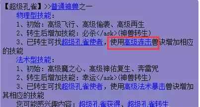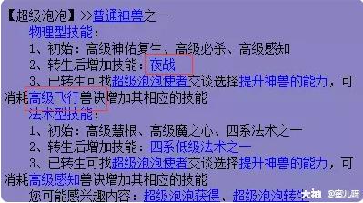比如超级孔雀、超级泡泡、超级神马等神兽你需要去洗属性点改成全力或者把全力洗了变加体质等。众所周知普通洗点需要如意丹、灵佑降级、飞升降低,这些花费成本都不低,而且如意丹只能洗部分点数不能全洗。而神兽可以通过两次类型转换来重置属性点,并消耗特定的高级要诀来提高自己(生肖神兽需要重新打书)。