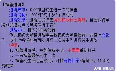 神兽二转条件:神兽等级≥60级且转生过一次,消耗: 4500v梦幻币及5个神兜兜