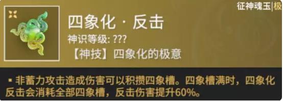四象化·反击:非蓄力攻击造成伤害可以积攒四象槽。四象槽满时,四象化反击会消耗全部四象槽,反击伤害提升60%。