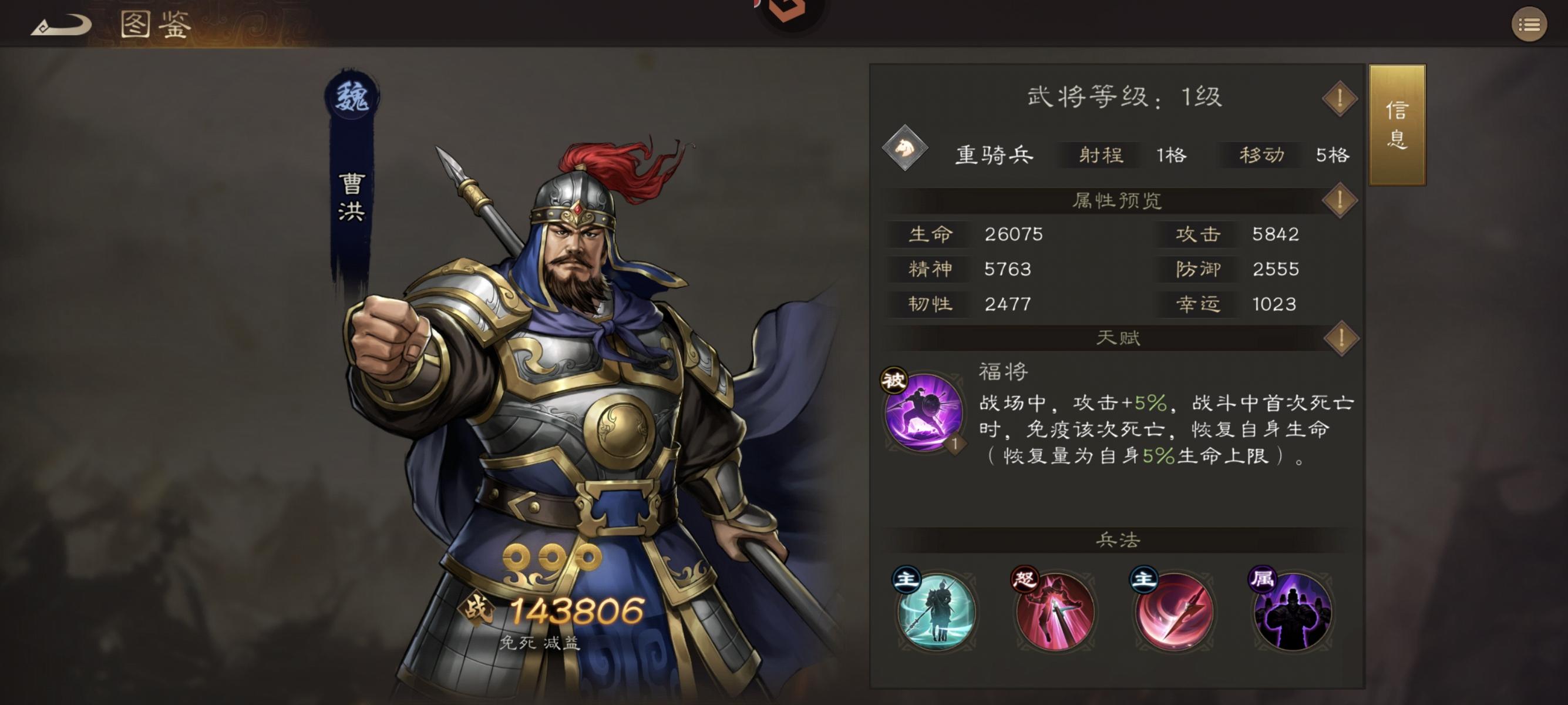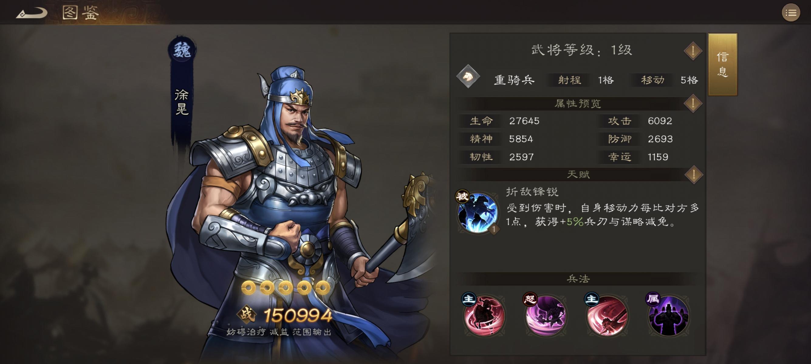 功能性武将,可冲锋3格,大招能对“移动力低于自身”的敌人施加断粮(减疗/禁疗),需搭配曹操等增移速武将。无需高练,留1个8星(6星亦可)应对特定阵容即可。