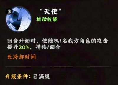 2、被动技能天使在回合开始时使随机1名我方角色攻击提升20%,持续1回合无冷却,随机增益增加队伍灵活性,鼓励多样化配置,可帮助打破僵局,影响胜负走向。