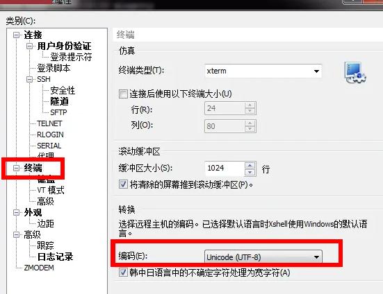 3、然后点击左侧栏中的"终端"选项,最后点击"编码"右侧的选项框下拉按钮,选择列表中的"Unicode(UTF-8)",这样是为了避免日志文件会出现乱码的情况。
