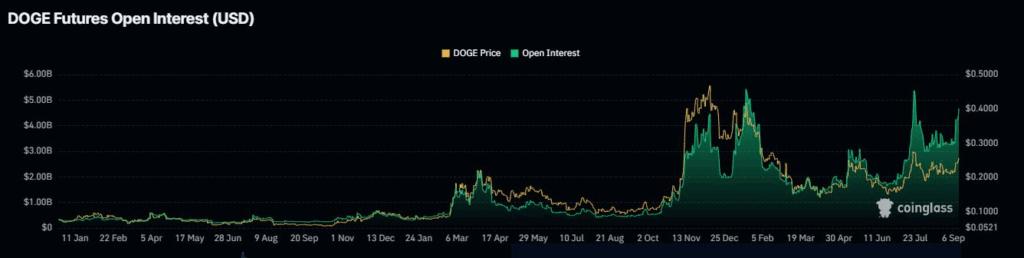 狗狗币未平仓合约接近 50 亿美元,但鲸鱼正在获利了结