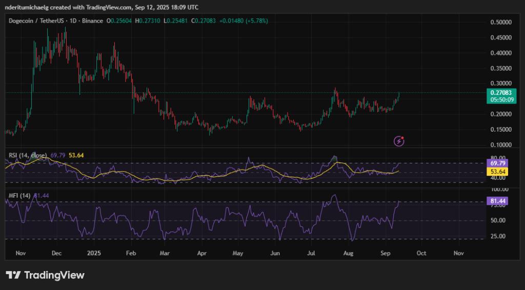 狗狗币的最新一轮上涨标志着其今年第三次大幅上涨。此前的几次上涨尝试均未能将价格推高至 0.30 美元以上。截至发稿时,这枚表情包币的价格为 0.27 美元,几乎已超买。