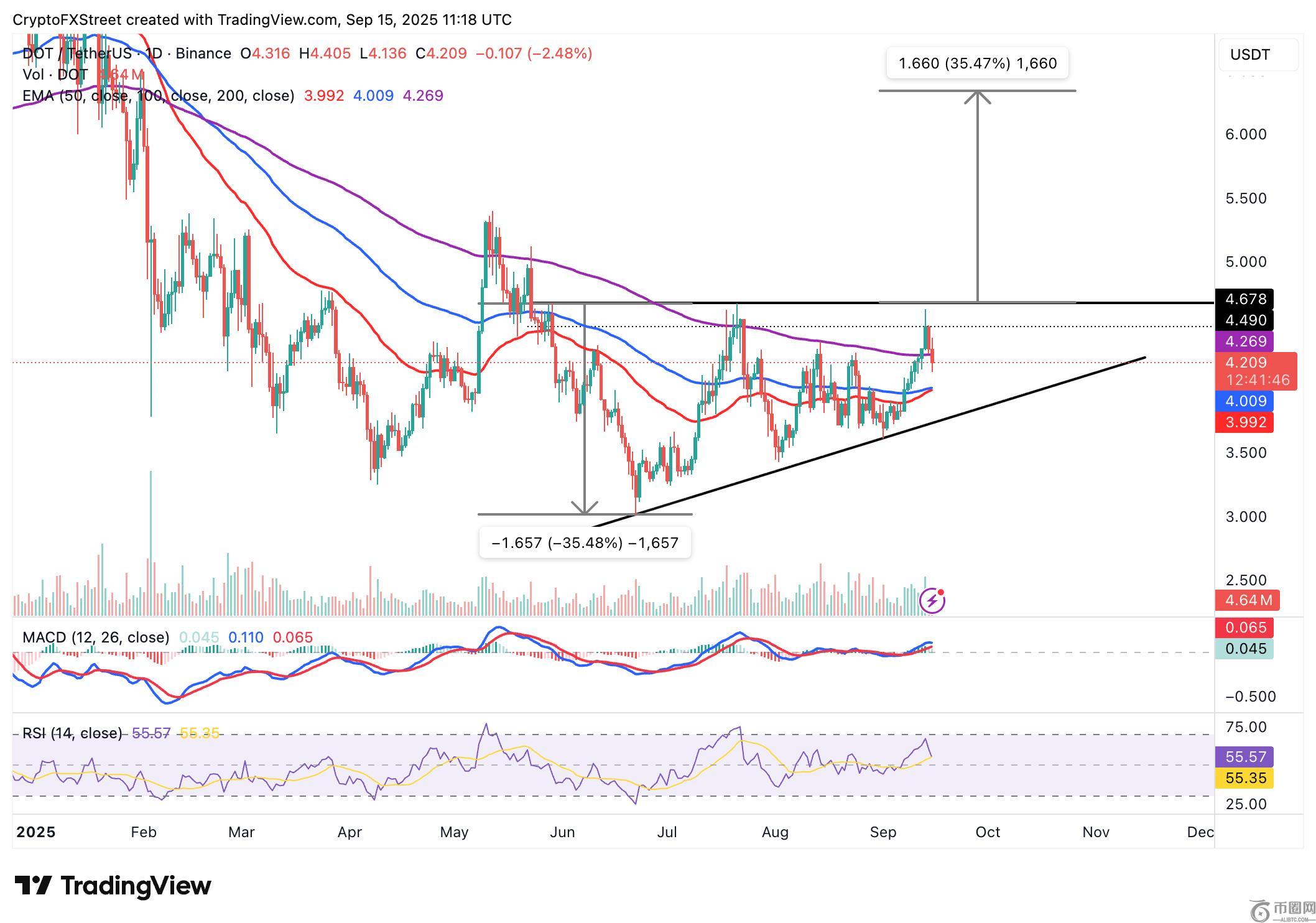 Polkadot 价格预测:由于网络供应受限,DOT 有望突破 35% 的三角形