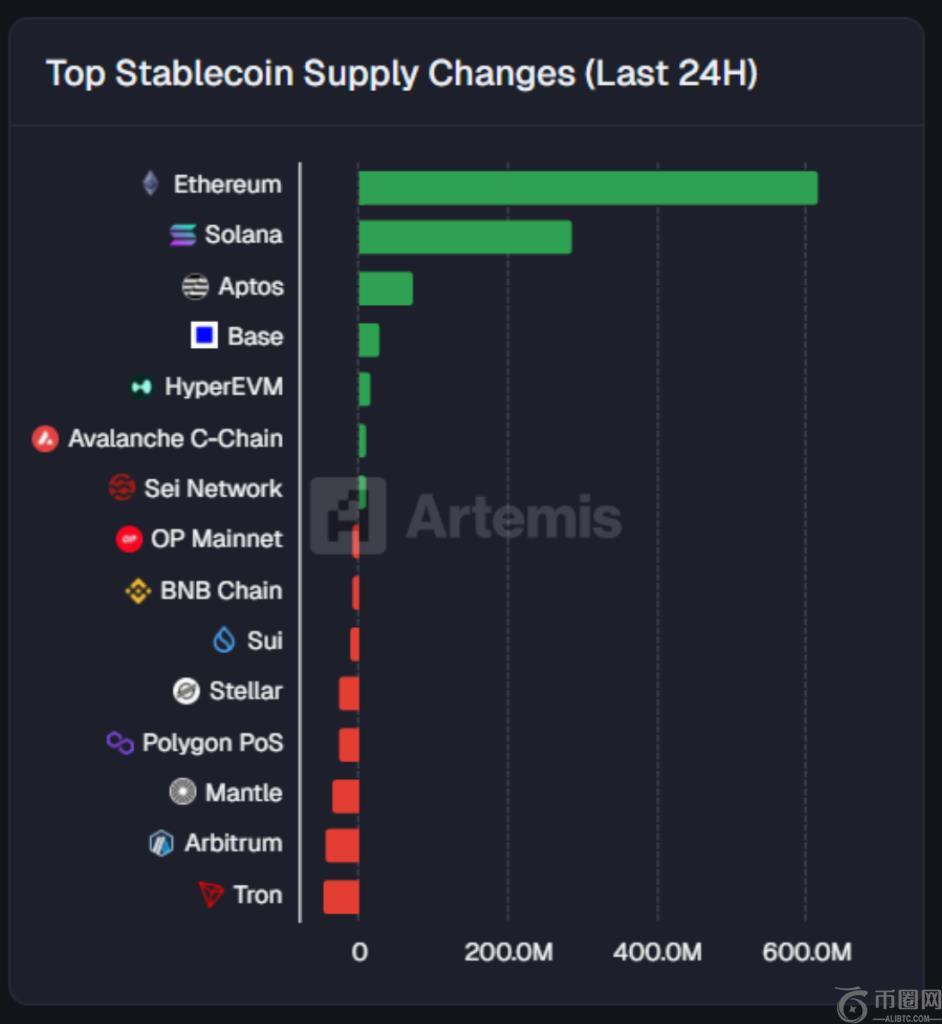 目前稳定币的总供应量已超过 2800 亿美元,阿尔忒弥斯、以太坊和 Solana 占据了这一增长的大部分: