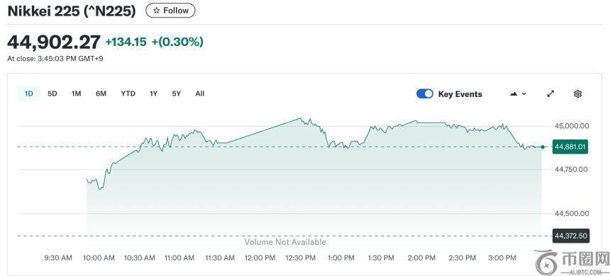 9月16日,在美国科技股隔夜强劲表现的支撑下,东京股市普遍上涨。人工智能和半导体股的买盘推动了日经225指数首次短暂突破45,000点。最终,该指数收盘报44902.27点,上涨134.15点,涨幅0.30%。
