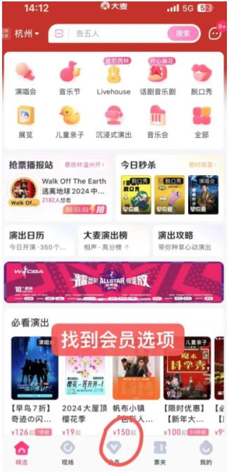 打开大麦app,进入首页,找到会员按钮,点击会员。
