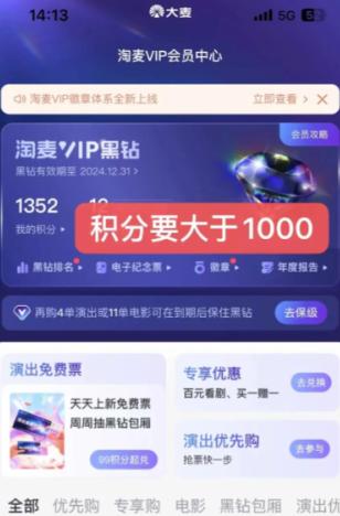 第二部:进入到会员的界面。可以看到淘麦VIP,如果那种刚注册的新号,或者没抢过票的,是没有会员的,就没办法抽奖。需要是vip黑钻,同时积分>1000,不然没办法抽优享购。