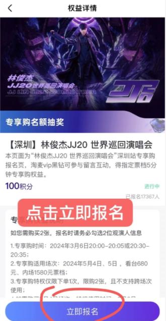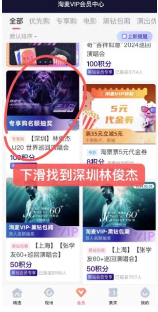 有些场次演唱会,大麦开辟的专享购买通道,要提前报名抽奖,抽中了就有购买资格(注意是资格),另外必须是大麦黑钻会员,在演唱会购票界面或者会员报名,一般在抢票前2小时开奖,中了奖就去专享购赛道抢票,这个赛道不是必有票,只是买到票的几率大一点
