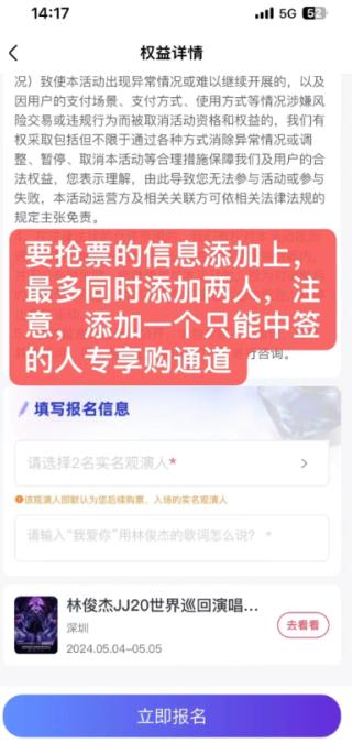 第五步:将需要观演的人,实名信息输入。专享购最多只能添加2人,最少1人。如果只添加了一个人,那么后面抢票专享购也只能用登记了专享购的观影人去抢票,没登记的是不能抢的。
