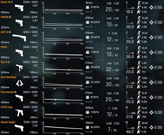 首先介绍USP消音版和P2000这两把CT默认手枪,选择哪一把作为默认手枪是每一个CSer都曾经纠结过的问题。这两把手枪除了弹夹容量和备弹数量之外,参数几乎完全一致,伤害、穿甲都完全一致;准确度P2000单点稍微更精准一些,连续击发时几乎没有区别。他们的Spray Pattern稍有不同,USP-S的散布特性稍微更好,更近似于圆形散布,但P2000总体散布稍小。但是这影响并不大,因为请永远不要使用这两把手枪快速扫射,它们需要命中有甲敌人身体6到7发才能完成击杀,而考虑到敌人总是在运动中,可能一梭子弹打完敌人还存活着。因此使用这两把的手枪的用法应该是瞄准头部单发射击,即使距离很近,也应该尽量追求瞄准头部。