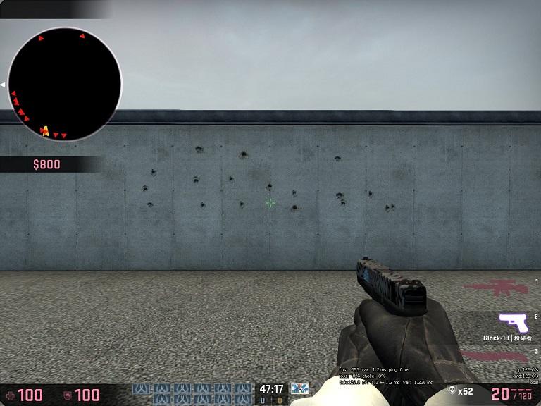 而T的默认手枪只有Glock一种,其伤害仅有USP-S和P2000的80%,同时穿甲能力稍弱,近距离需命中敌人胸部8发才能击杀,手枪局500单位之内击中头部才能秒杀。但是Glock是一把非常精准的手枪,同时容量也很大,这给了使用它很大的灵活性。一般T手枪局的思路应该是尽量通过走位和掩体保护,使T尽量拉近与CT的距离,在近距离交火。在瞄准方面,Glock也应该始终尽量追求瞄准对手的头部,因为其击中身体的伤害真的是太低了。至于三连发模式,笔者不建议使用,主要原因有两点。第一是三连发的散布是随机的,其不光存在垂直的上跳,水平方向的偏差也可能很大;第二就是单发模式瞄准目标后可以持续射击,而三连发需要不断重复压枪过程,操作更为复杂。三连发只有手枪局敌人没有头盔,同时距离非常近的情况下才能发挥较好的效果。