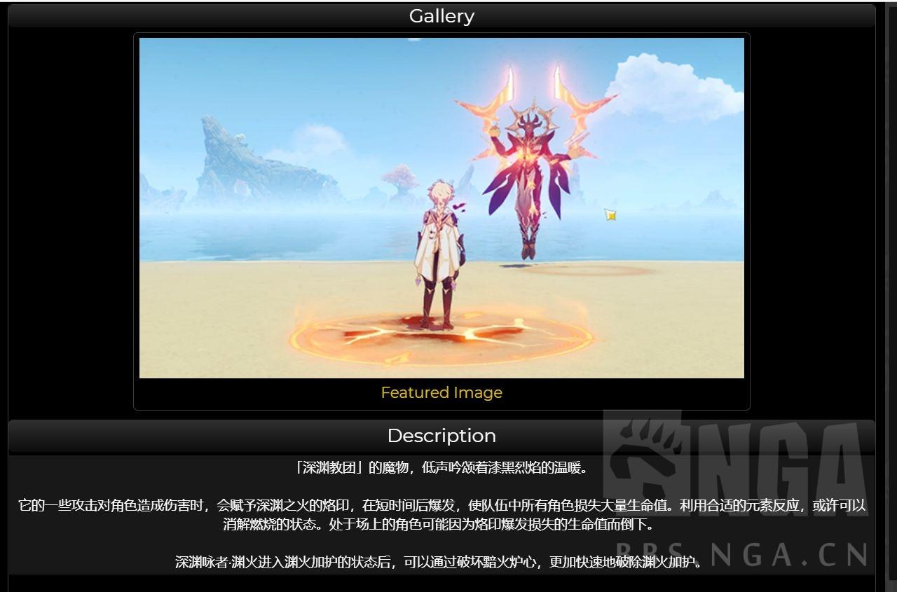 对角色造成伤害时,赋予深渊之火印记,短时间后爆发,使队伍所有角色损失大量生命值,利用合适的元素反应,可以解除燃烧状态