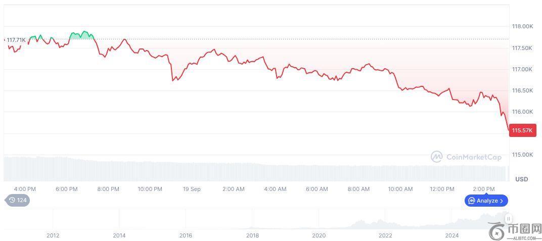 根据 CoinMarketCap 的数据,比特币 (BTC) 目前的价值为115,966.23 美元,市值为2.31万亿美元,占据57.24%的市场主导地位。过去24小时内,其股价下跌0.43%,尽管90天内上涨了12.76%,但仍表现出波动性。