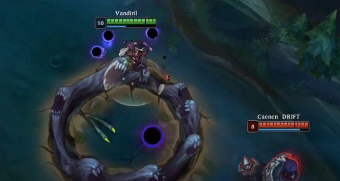 辛德拉将河蟹打至残血,随后利用自己W技能,将残血的河蟹抓起并扔想要布置视野的地方,牧魂人顺势把河蟹框柱,河蟹死亡后遁入地中,一直想往他的目的地游动,但是由于被牧魂人框柱无法移动,于是河蟹提供的视野就留在框中,而提供的加速却在他正确的地方,并且依然提供小龙处的河道视野。