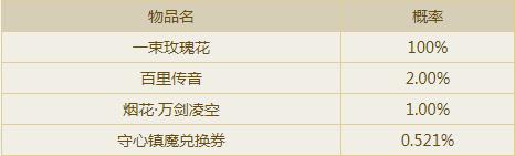 开启玫瑰镇魔礼盒一定可开出1个【一束玫瑰花】,另有机会开出不绑定的【守心镇魔兑换券】(使用可获得符合自身流派的不绑定武器时装)、百里传音和烟花·万剑凌空。