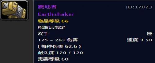 ID:17073Earthshaker物品等级 66拾取后绑定双手 锤175 - 263 伤害 速度 3.50( 每秒伤害 62.6 )耐久度 120 / 120需要等级 60击中时可能:将附近所有的敌人击倒3秒。装备:+22 攻击强度。