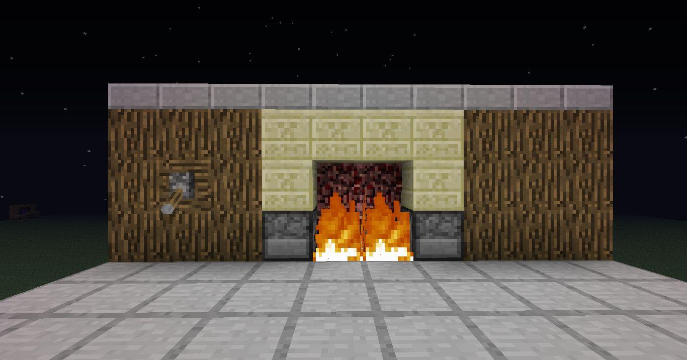 这与老式壁炉类似,但更复杂。简单地用圆石做一个5x2的底面积,然后用地狱岩替换中间靠后的方块。接下来,在地狱岩的每边各放置一列3个方块高的石砖,然后在每边放置石砖楼梯(使它们的阶段朝向中心)。在两个楼梯之间添加一个石砖,并在下面附上一个额外的石砖。从中心砖建立一列向着中心的石砖, 直到它出了屋子,在顶上放置一个火把来模仿一个烟囱的火。最后,点燃地狱岩并在通路周围添加地狱砖栅栏。你也可以在通路下面添加石砖楼梯。看图片供参考。
