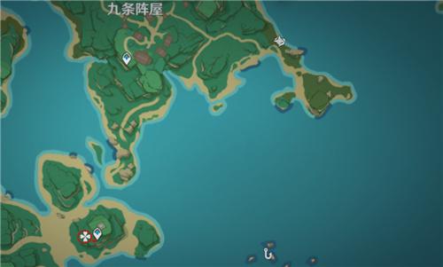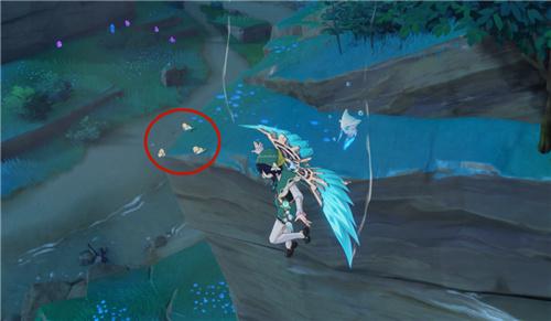 2.然后是稻妻九条阵屋下边小岛的传送点,跳下来往左边走,到图示的位置之后即可发现金团雀是不会飞的。