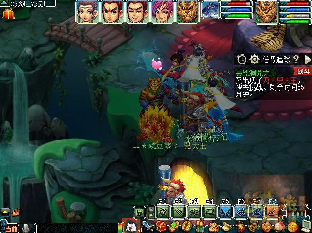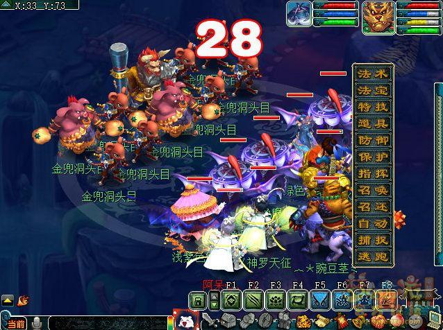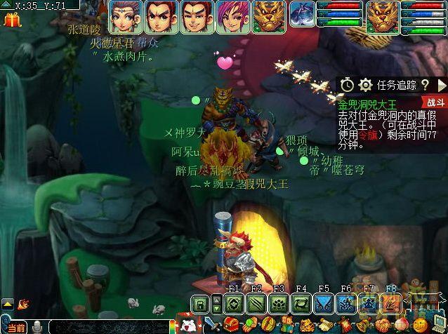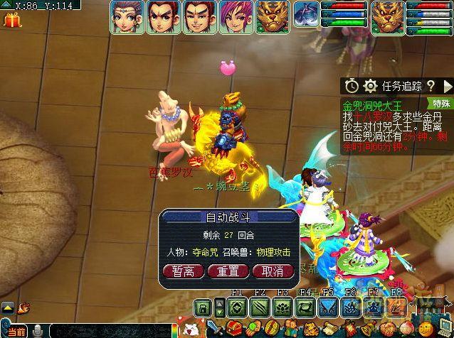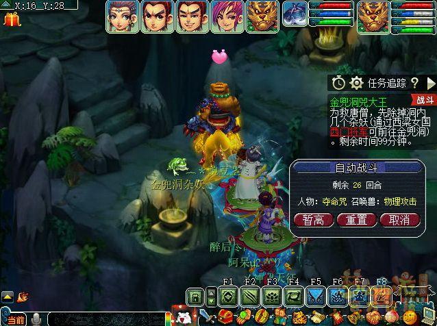 3、金兜洞头目战斗跟假兕大王一模一样,只是没有主怪牛妖,其它怪是一样的。还是用上面打法就可以了。这边炎魔神法伤会比较高,对于法抗较低配置不好的队伍建议辅助系,进场喝个高品质珍露酒,第2回合接个罗汉。这样就会比较轻松了。