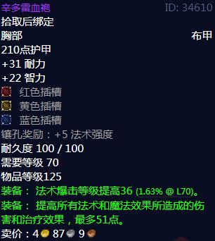辛多雷血袍属性,拾取后绑定,胸部布甲,210点护甲,+31耐力,+22智力,红色插槽,黄色插槽,蓝色插槽,镶孔奖励:+5法术强度,耐久度100/100,需要等级70,物品等级125,装备:法术爆击等级提高36(1.63%@L70)。装备:提高所有法术和魔法效果所造成的伤害和治疗效果,最多51点。