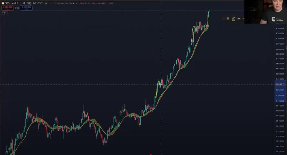 黄金就是如此。你可以看到。它经历了一轮大幅上涨,然后一路横盘整理,直到牛市支撑带跟上,然后才创下历史新高……这种情况发生过很多次,它会等待21周EMA或20周SMA(简单移动平均线)。