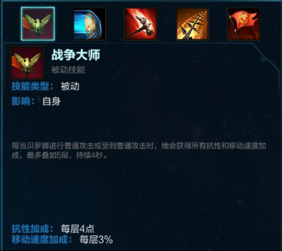 被动战争大师,贝罗娜成为一流防御型神明的因素。这个被动技能的核心主要是移动速度的加成,玩家有了高移动速度的加成后在接下来的战斗中会持续的攻击来保证自己BUFF不会停下来。