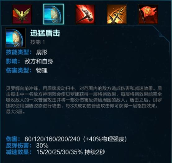 1技能迅猛盾击,贝罗娜开团的关键性技能。这个技能直接让贝罗娜冲向对手,同时赋予自身一层格挡效果,如果冲锋的时候命中的敌人越多那么获得的格挡层数就越多。格挡会免疫一次敌人的普攻并且带有伤害反弹的效果。重要的是当玩家技能停止后攻击方式变为剑盾姿态,每三次普攻就会获得一次格挡,这个是很关键的。