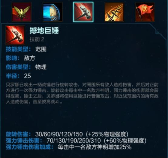 2技能撼地巨锤,贝罗娜会对周围的敌人进行旋转攻击,攻击结束后还会对正前方的敌人进行一次强力攻击,而且旋转的时候攻击的敌人越多那么强力攻击的伤害就越高。当玩家技能结束后会获得巨锤形态,对攻击范围内的所有敌人造成伤害直至战斗结束。