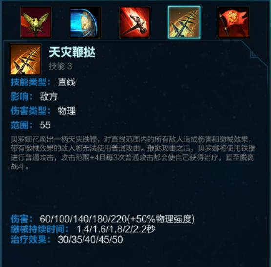 3技能天灾鞭挞,贝罗娜会召唤出一根铁鞭对直线范围内的敌人造成伤害,并且获得铁鞭攻击形态。这个形态下玩家每次三次攻击会获得一次治疗的效果,而且攻击范围得到了极大的增加,这个在单挑的时候是一个不错的技能形态。